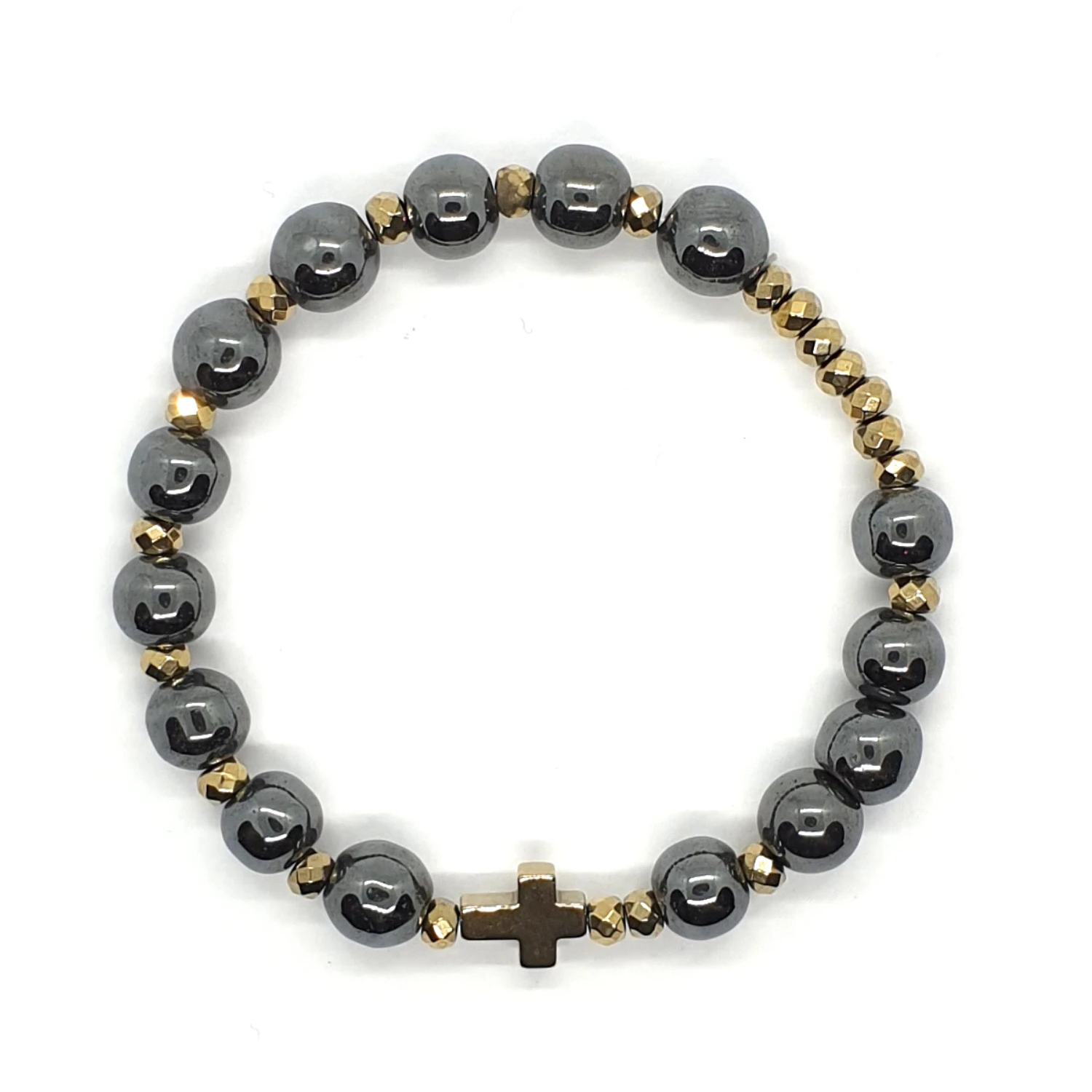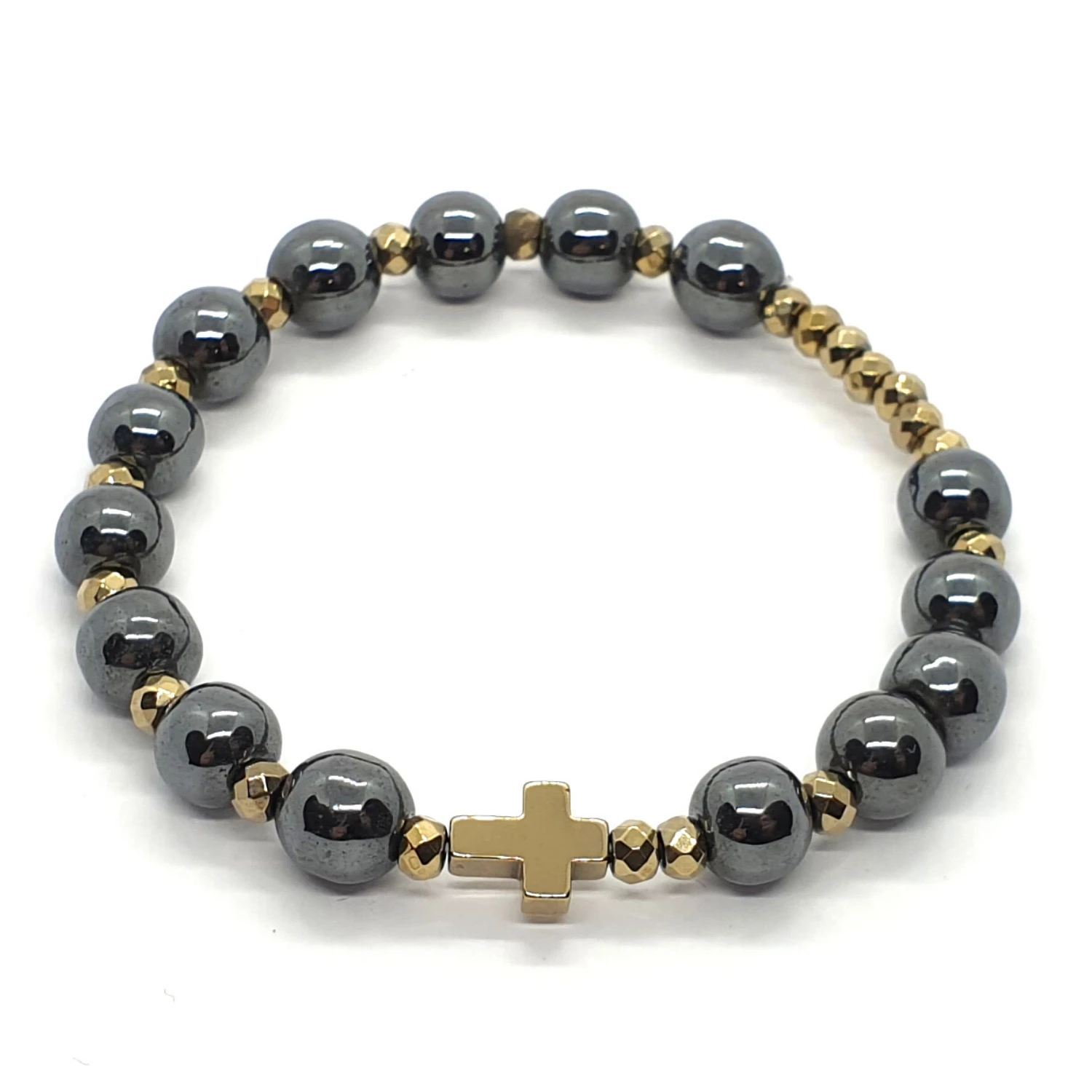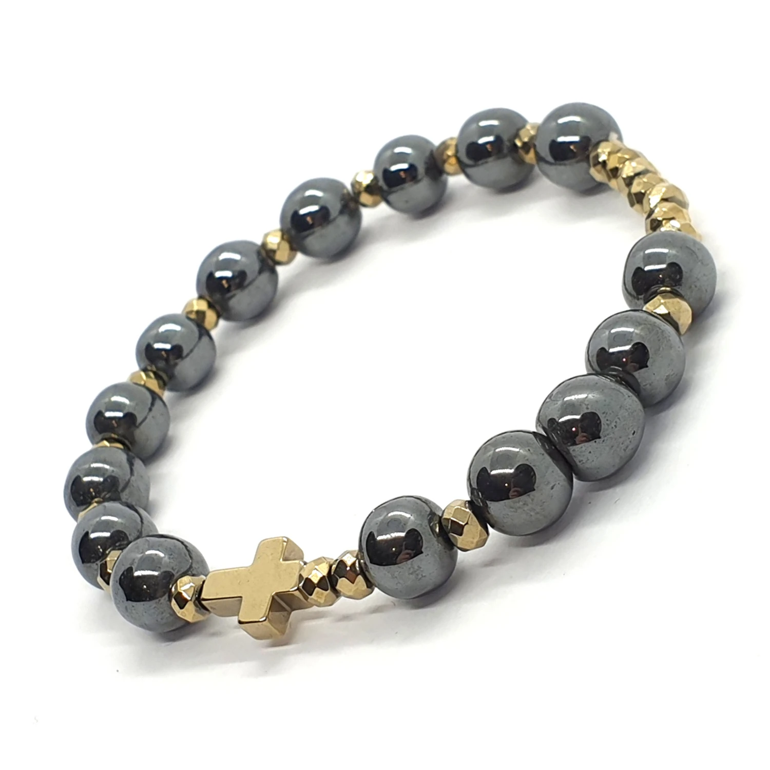 - hematyt platerowany na złoty: krzyżyk 10x8 mm i oponki 4x3 mm