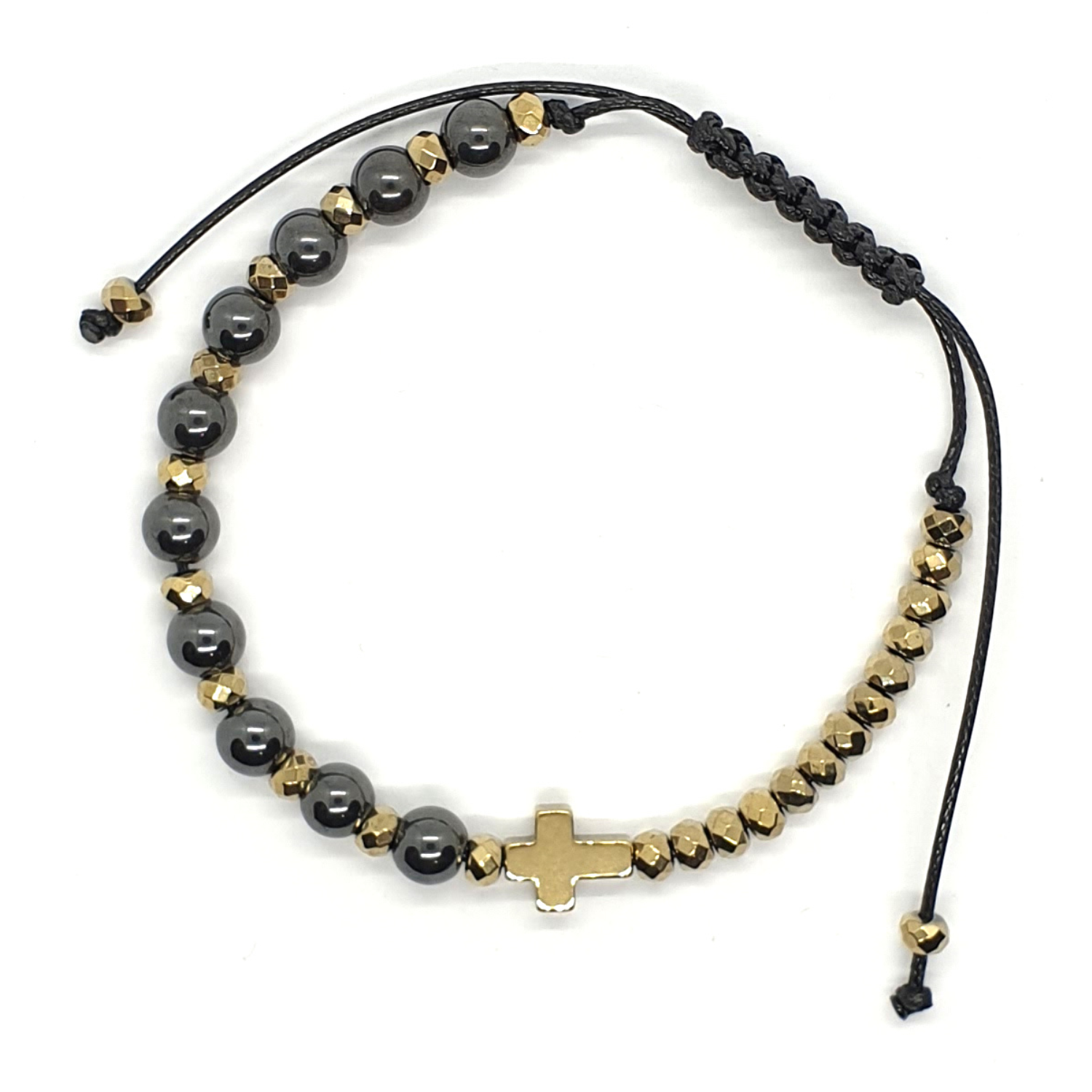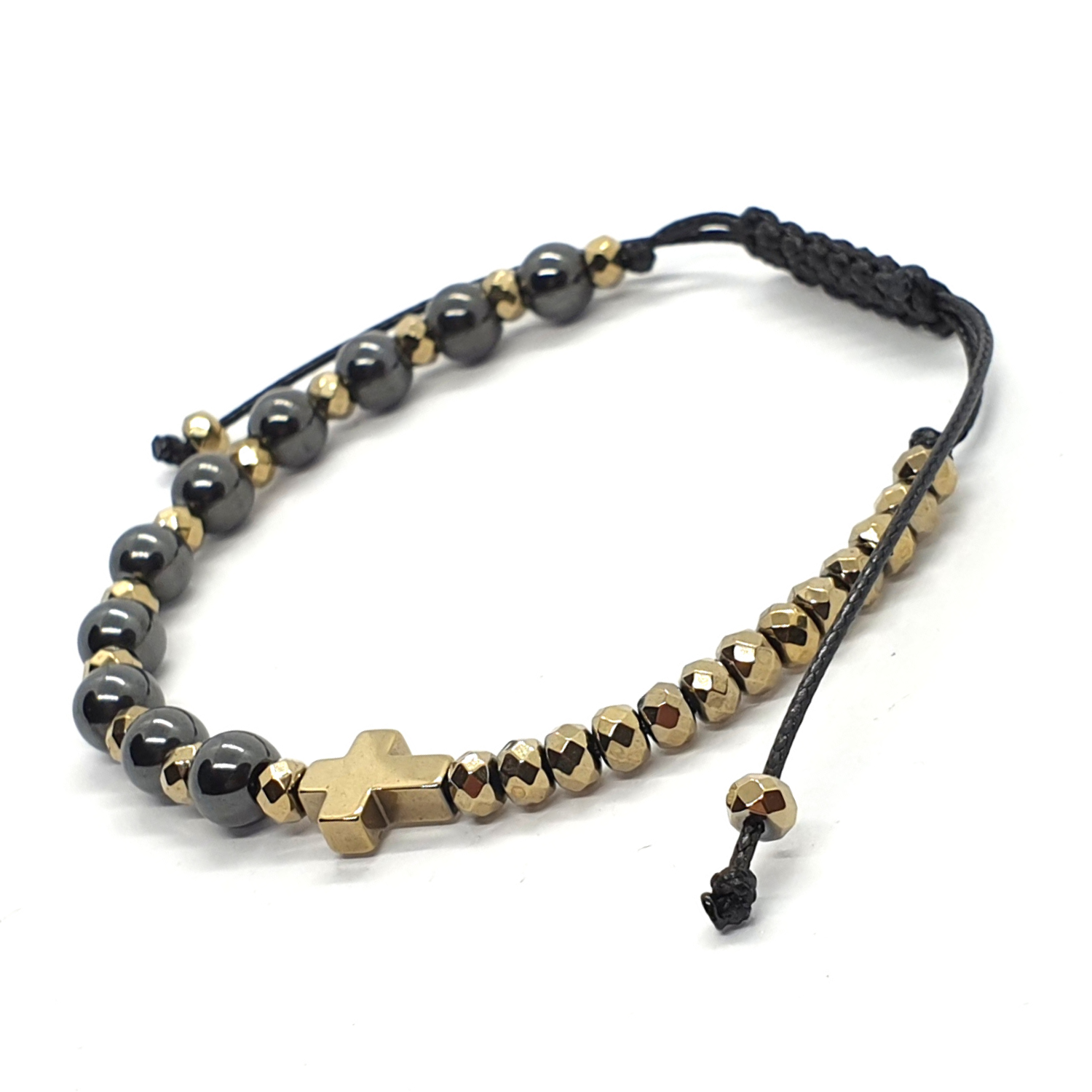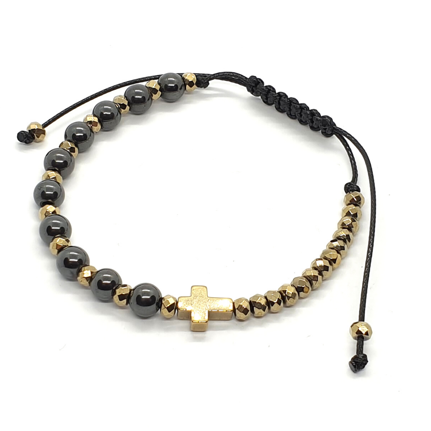 - hematyt platerowany na złoty: krzyżyk 10x8 mm i oponki 4x3 mm