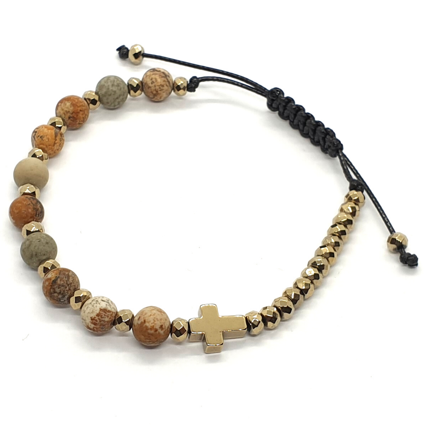 - hematyt platerowany na złoty: krzyżyk 10x8 mm i oponki 4x3 mm
