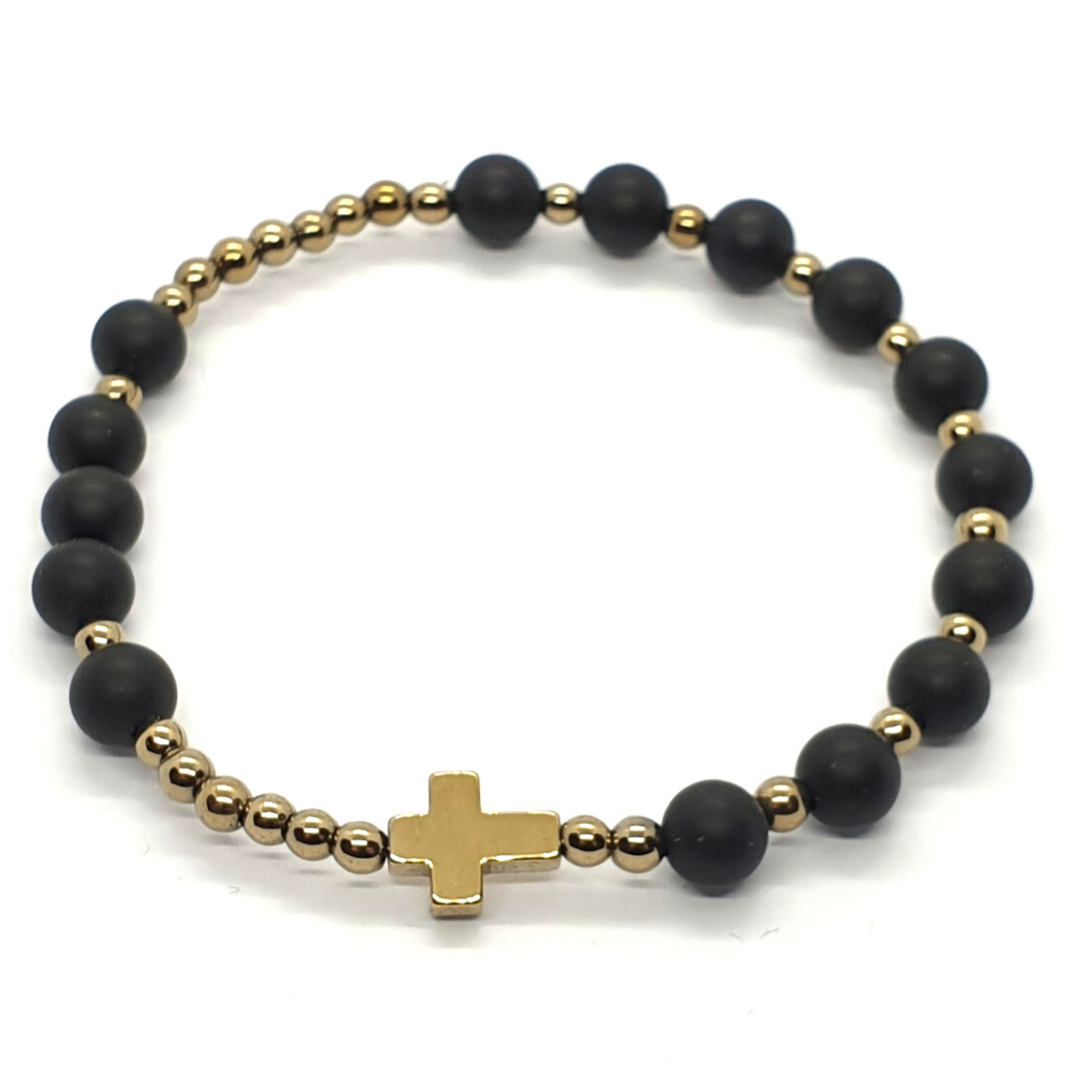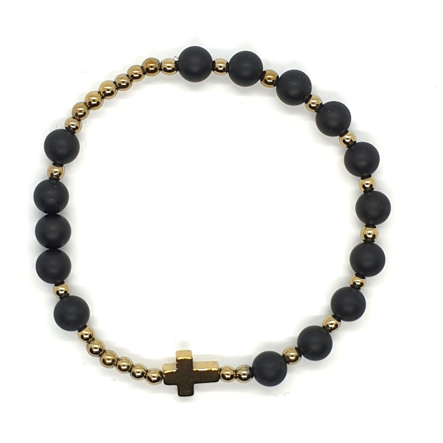 - hematyt platerowany na złoty: krzyżyk 10x8 mm i kule 3 mm